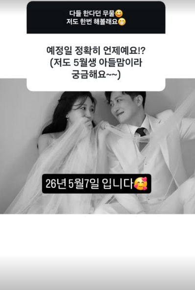 이어 나솔이에 대해 "1월 5일 정밀초음파 검사했고 건강히 잘 자라고 있다. 건강해서 너무 기특하고 고맙다"라며 "재왕절개 선택 예정이다. 자연분만 너무 무섭다"라고 답했다. 또한 "예정일은 5월 7일이며 현재까지 14kg 쪘다"라고 덧붙였다.