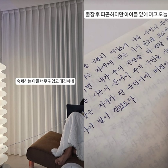이어 비행기 사진과 함께 "호다닥 왔네"라는 글을 남겼고, 노트북 앞에 앉아 있는 아들의 사진을 올리며 "숙제하는 아들, 너무 귀엽고 대견하네"라고 적었다. 또 "출장 후 피곤하지만 아이들 옆에 끼고 오늘도 필사"라며 시편 성경 구절을 적은 사진을 게시해 눈길을 끌었다.