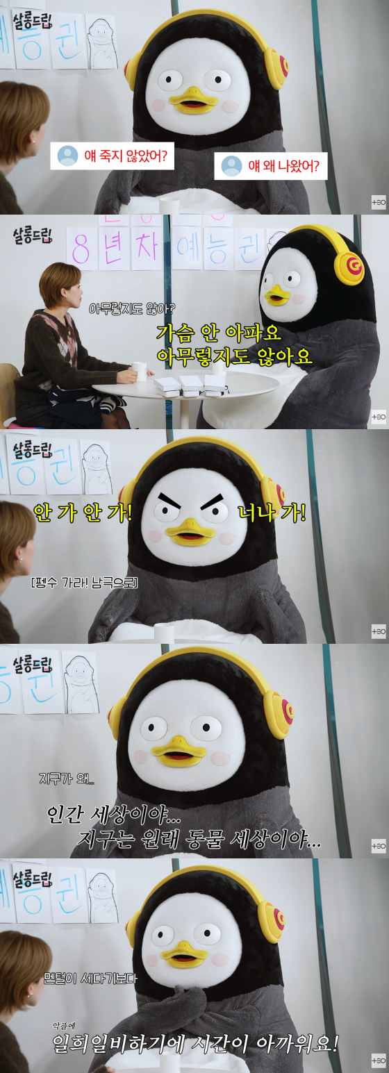 이날 MC 장도연이 악플에 대해 묻자 펭수는 "'얘 죽지 않았어?' '얘 왜 나왔어?' '퇴물 아님?' 그런 댓글들이 있었다. 가슴 아프지 않다. 퇴물 아니니까 이렇게 방송도 나오는 거 아니냐"고 의연하게 답했다.