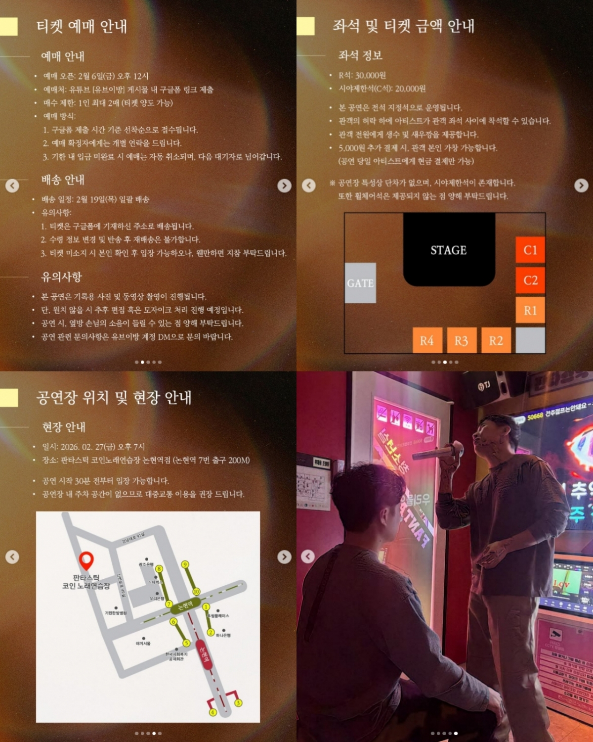 해당 사진에 따르면, 유세윤은 27일 오후 7시 논현에 위치한 한 코인노래방에서 단독 콘서트를 개최한다. 유세윤은 "최악의 상황 예상. 1. 매진 실패 2. 남자 6명 3. 극내향인 6명 4. 초외형인 6명 5. 노래방 휴점"이라고 덧붙여 웃음을 자아냈다.