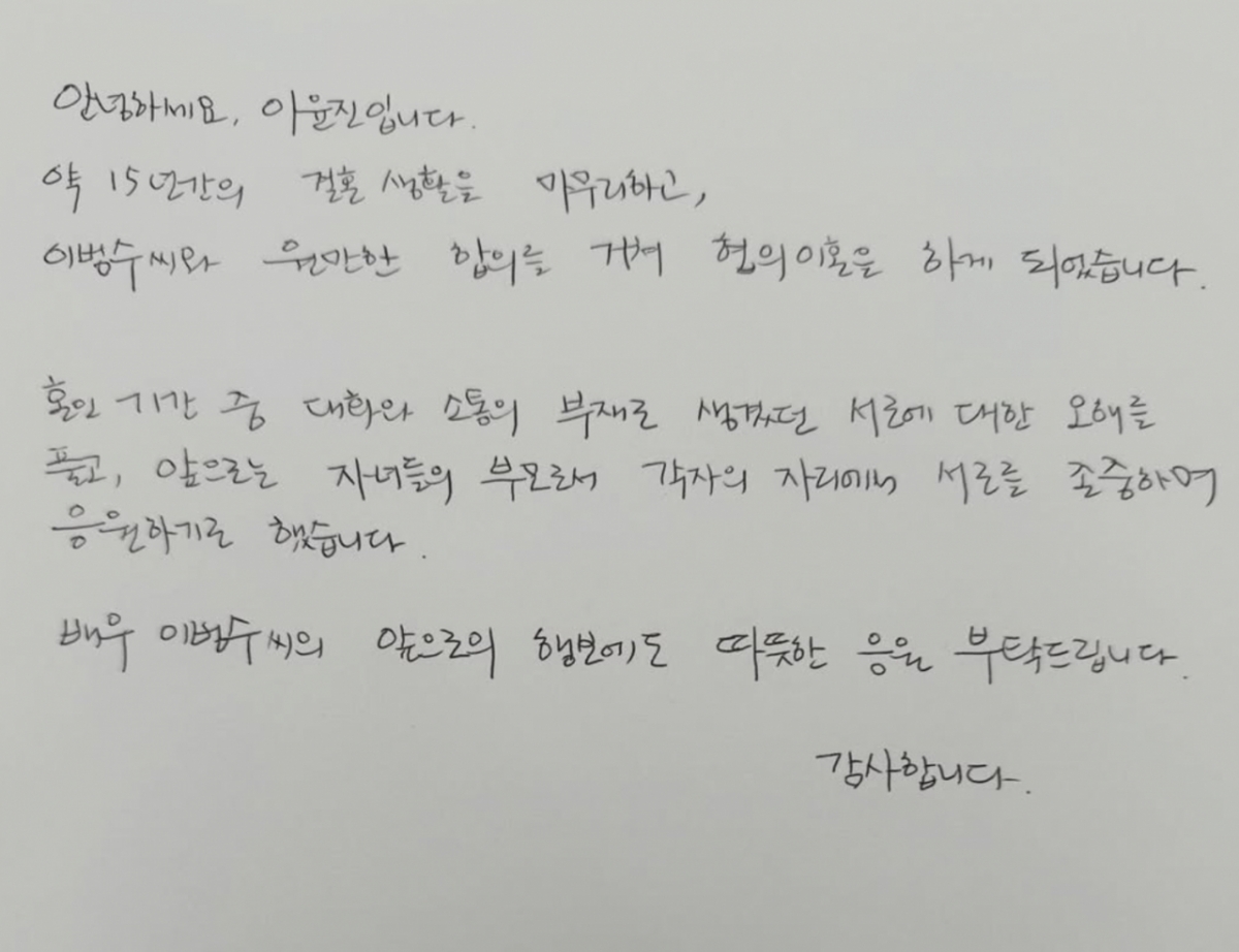 이윤진은 6일 직접 적은 손 편지를 통해 "약 15년 간의 결혼 생활을 마무리하고 이범수 씨와 원만한 합의를 거쳐 협의 이혼을 하게 됐다"라고 전했다.
