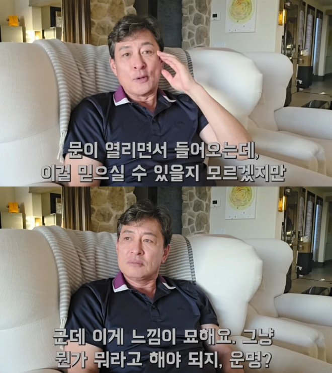 이어 "그때 아는 지인분을 만났는데 왜 장가 안 가냐고 하시더라. 소개나 해달라고 했더니 다음 날 연락 와서 소개팅을 시켜주신다고 하더라. 3~4일 있다가 가야 했지만 그걸 거절하고 가면 예의가 아닌 거 같아서 만나고 가기로 했다"면서 "문이 열리면서 들어오는데 내 눈에는 후광이 보였고, 느낌이 선녀, 천사 같더라. 심장이 벌렁벌렁 뛰고 그러진 않았는데 느낌이 묘하더라. 그냥 운명 같았다"고 당시 상황을 전했다.