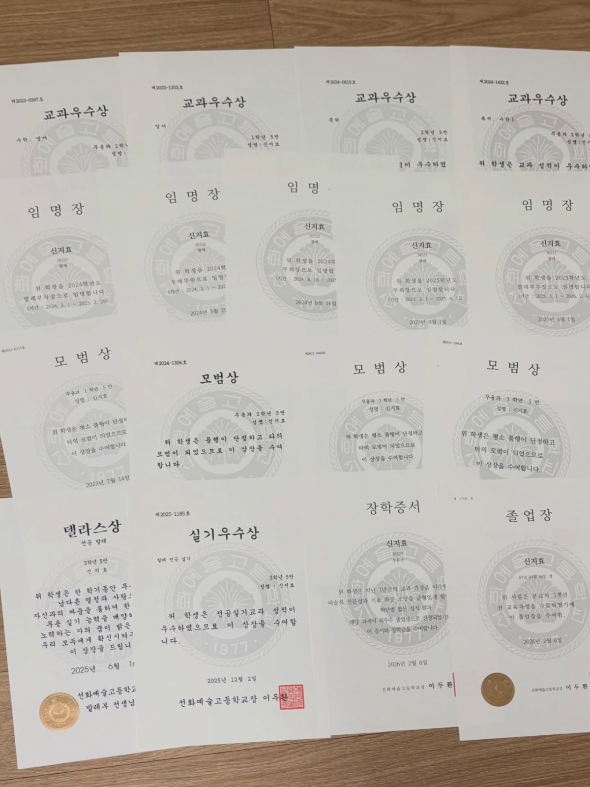 이와 함께 신지효 양은 졸업식을 기념하며 학교에서 꽃을 안고 찍은 사진을 남겼다. 그는 그 동 동안 받은 교과우수상, 임명장, 모범상, 장학증서 등 17개의 상장을 늘어놓고 고등학교 시절을 추억했다.
