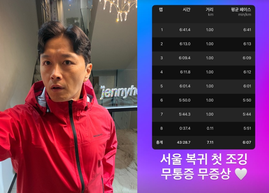 진태현은 11일 "서울 복귀 첫 조깅 무통증 무증상"이라는 문구와 함께 자신의 러닝 기록을 공개했다.