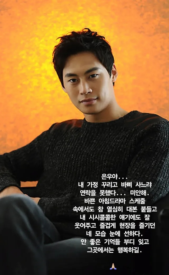 이어 박슬기는 "바쁜 아침 드라마 스케줄 속에서도 참 열심히 대본 붙들고 내 시시콜콜한 얘기에도 잘 웃어주고 즐겁게 현장을 즐기던 네 모습 눈에 선하다. 안 좋은 기억들 부디 잊고 그곳에서는 행복하길"이라며 정은우를 애도했다.