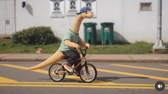 공개된 영상 속엔 민희진이 지난해 최초 하이브 관련 기자회견했던 당시 착용했던 의상을 그대로 입은 공룡 캐릭터가 콧노래를 부르며 자전거 타는 모습이다.