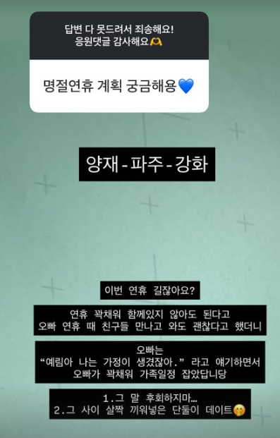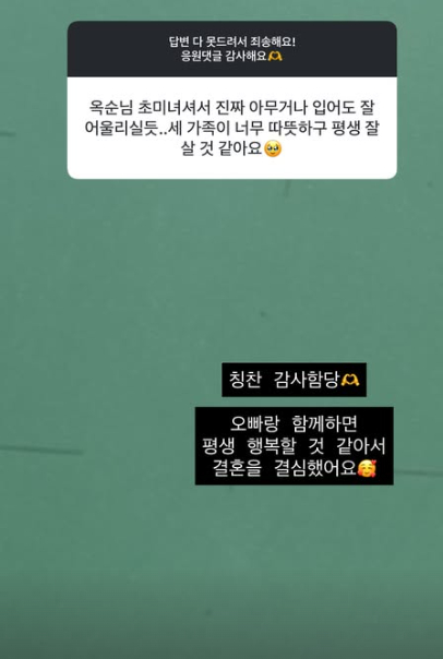 또한 "합가는 곧이요. 오빠 이사하기 전에 가전 가구 식기 등등 다 들일 수 있을까?"라며 "신혼집도 구해서 곧 이사 예정이다. 오빠가 맘 먹으면 그냥 막 일이 착착착 진행돼요. 문제는 집만 정함"이라고 답했다.