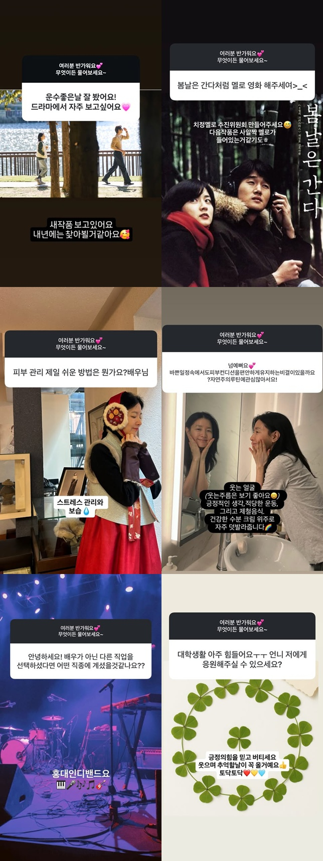 이영애는 반전의 생각을 공개해 모두를 놀라게 하기도 했다. 한 팬이 "배우가 아닌 다른 직업을 선택하셨다면 어떤 직종에 계셨을 것 같나요?"라고 묻자 이영애는 "홍대 인디밴드요"라고 답해 눈길을 끌었다.