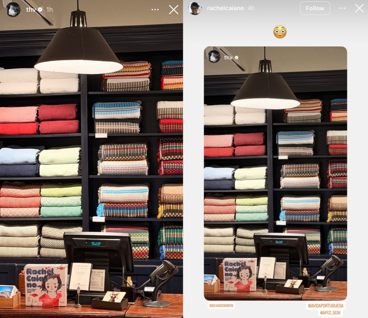 뷔는 최근 인스타그램에 방탄소년단의 공식 일정을 위해 방문한 포르투갈에서 리스본에 위치한 한 매장의 사진을 게재했다. 사진 속 선반에 진열된 다채로운 색상의 블랭킷과 계산대의 일러스트 북이 눈길을 끌었다.