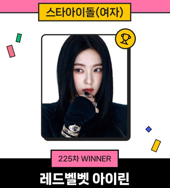 아이린은 12일 오후 3시 1분부터 19일 오후 3시까지 진행된 225차 스타랭킹 스타아이돌 여자 랭킹 투표에서 1만 8150표로 1위에 올랐다.
