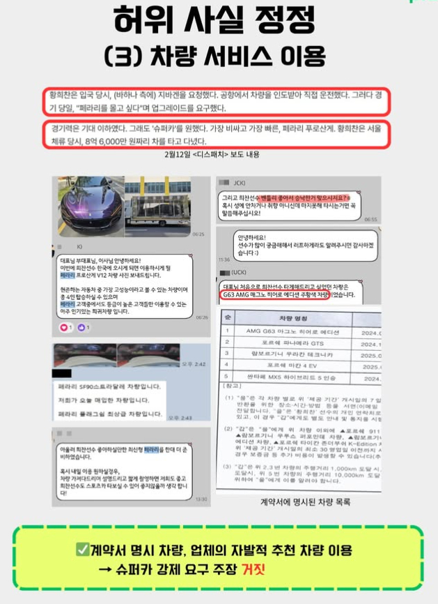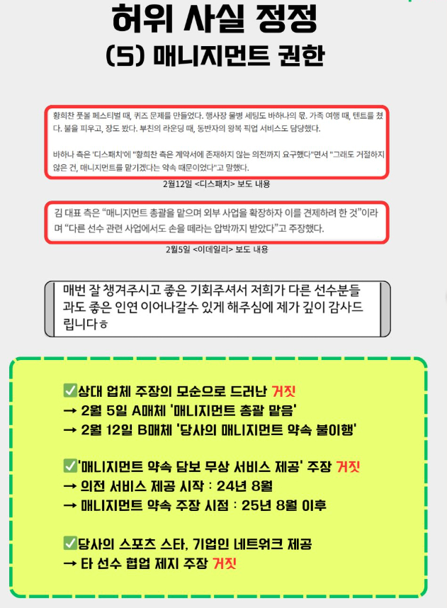 특히 황희찬을 비롯해 가족들도 업체 측에 갑질을 했다는 의혹에 대해선 "황희찬 및 그의 가족 모임에 초대와 의전을 부탁한 것이 아니며, 굳이 사양했음에도 워크숍이라는 명분으로 따라와 의전 업무를 수행했다"며 "비더에이치씨 및 가족들은 업체 측에 식사 및 선물, 경기 티켓 등 접대 비용으로 지출한 금액이 훨씬 크다. 계약서상에도 직계 가족과 소속사에 서비스를 지원한다고 적혀 있다. 격려 차원에서 1,100만 원을 이체한 사실도 있다. 정산금 '0원'이라는 말은 앞뒤가 맞지 않는다"고 지적했다.