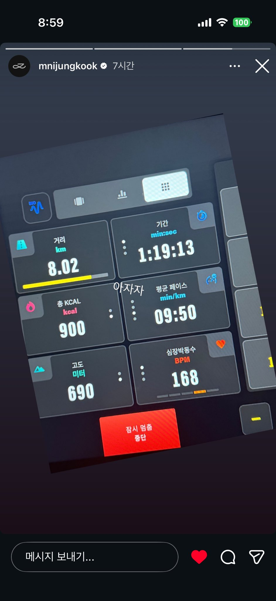 정국은 지난 20일 새벽 자신의 인스타그램 스토리를 통해 운동 중인 모습을 공개했다. 그는 "아자자"라는 문구와 함께 러닝머신에서 1시간 19분 동안 8km 이상을 뛰며 총 900kcal를 소모한 인증 사진을 게시했다. 정국은 운동에 대한 뜨거운 열정을 보이며 자기 관리에 소홀하지 않은 모습을 드러냈다.