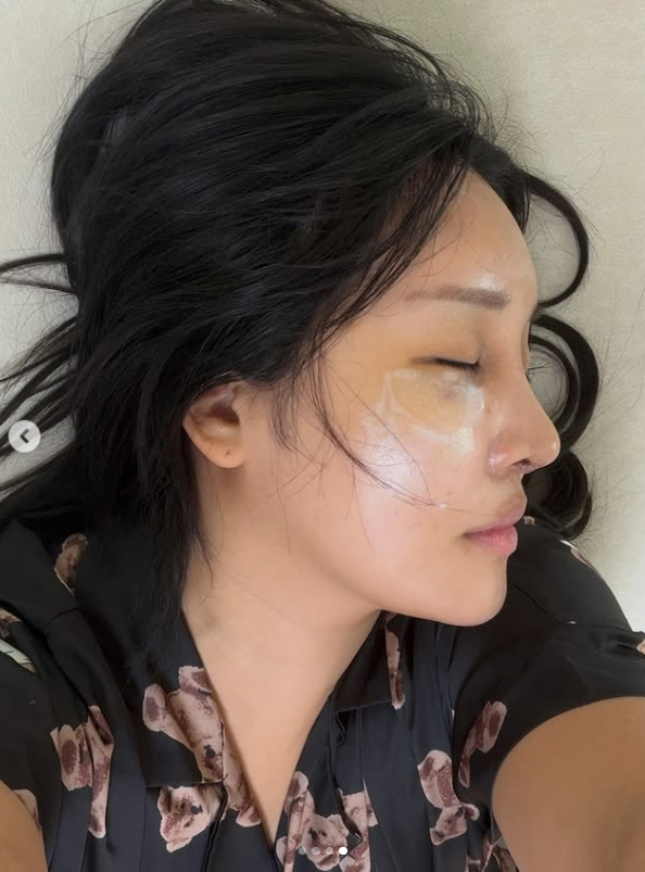 사진 속 랄랄은 눈가에 노란 멍이 든 채 눈가 팩과 연고를 바르고 누워 있는 모습. 멍 자국에도 불구하고 오똑한 콧날과 날렵한 턱선 등 자기주장 강한 이목구비가 눈길을 끈다.