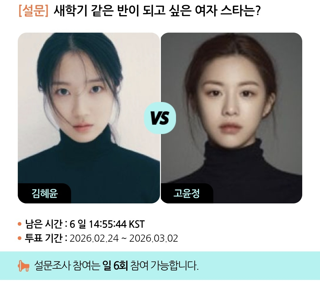 모바일 아티스트 종합 콘텐츠 앱 스타폴(STARPOLL)은 24일부터 3월 2일까지 '새학기 같은 반이 되고 싶은 여자 스타는?'이라는 주제로 설문 조사를 진행한다.