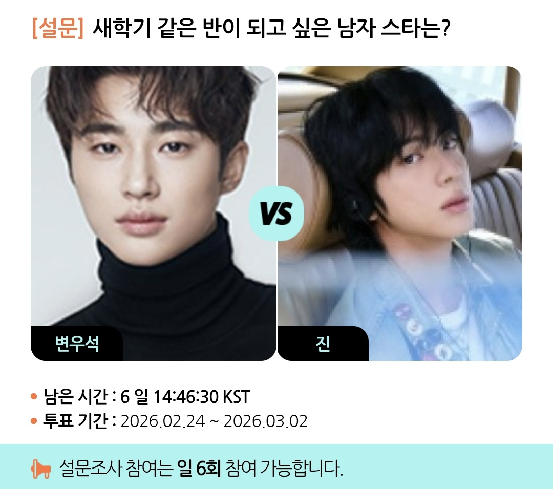 모바일 아티스트 종합 콘텐츠 앱 스타폴(STARPOLL)은 24일부터 3월 2일까지 '새학기 같은 반이 되고 싶은 남자 스타는?'이라는 주제로 설문 조사를 진행한다.