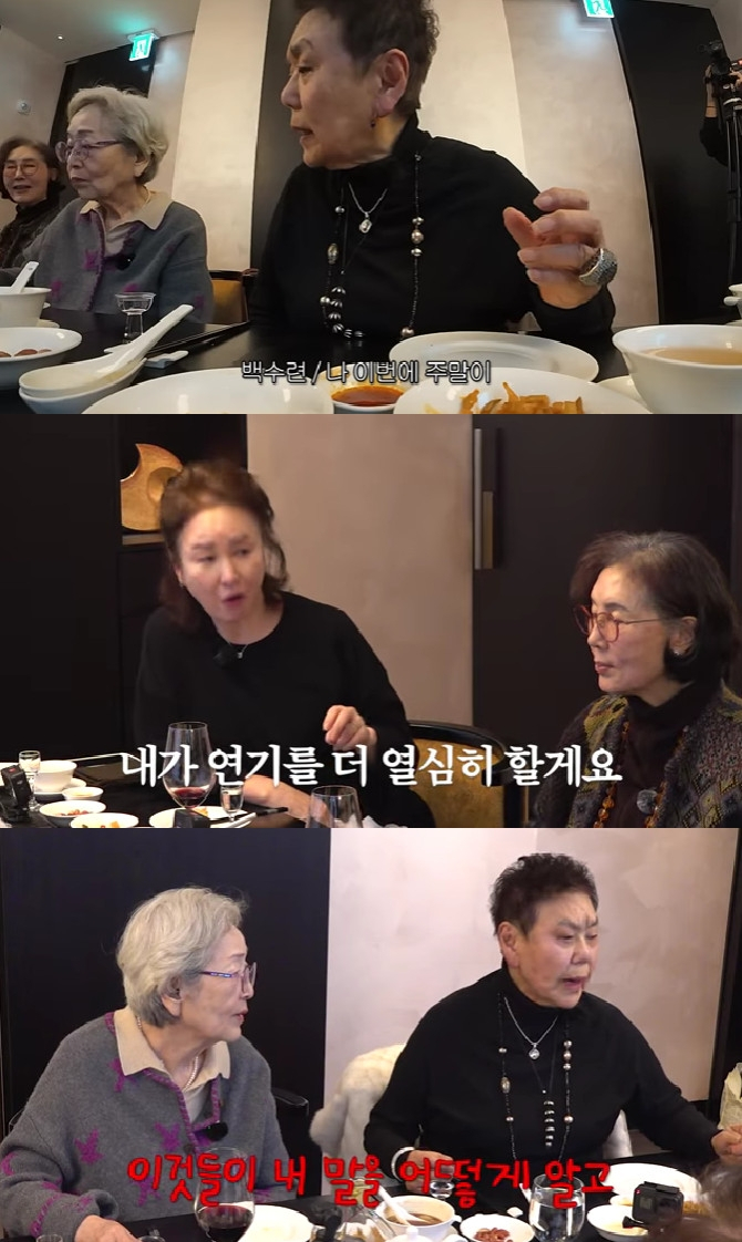 이에 김미숙은 "그럼 내가 연기를 잘 못했다는 거 아니냐. 더 열심히 하겠다"고 했고, 반효정은 "쟤 내일모레 70세다. 영옥 언니는 젊을 때부터 할머니 역할 했다"고 말했다. 김영옥은 "그냥 연기할 수 있으면 행복한 거다"라고 덧붙여 눈길을 끌었다.