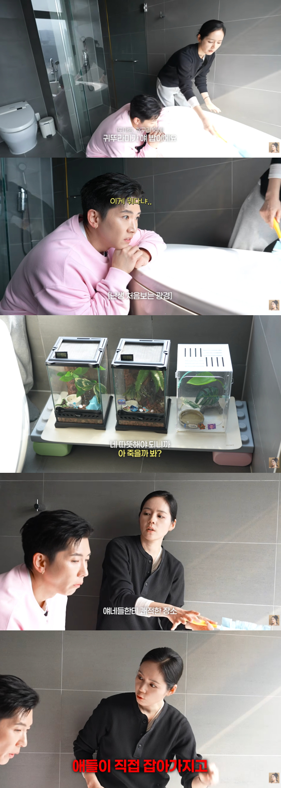 알고 보니 욕조 안에 도마뱀 두 마리, 개구리 한 마리, 먹이용 귀뚜라미 100여 마리를 키우고 있었던 것. 이를 본 브라이언은 깜짝 놀라면서도 이내 침착하게 반려동물들을 지켜봤다.