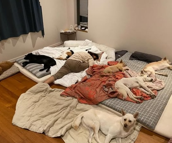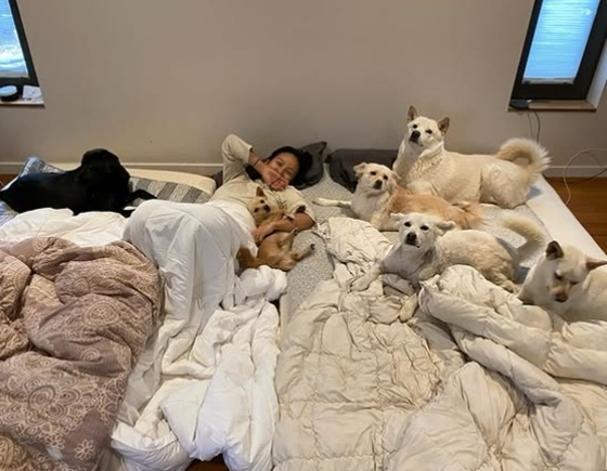 공개된 사진 속에는 반려견들 사이에서 누워 있는 이효리의 모습이 담겼다. 반려견들에게 둘러싸인 채 행복한 미소를 짓고 있는 이효리는 평온함을 자랑했다.