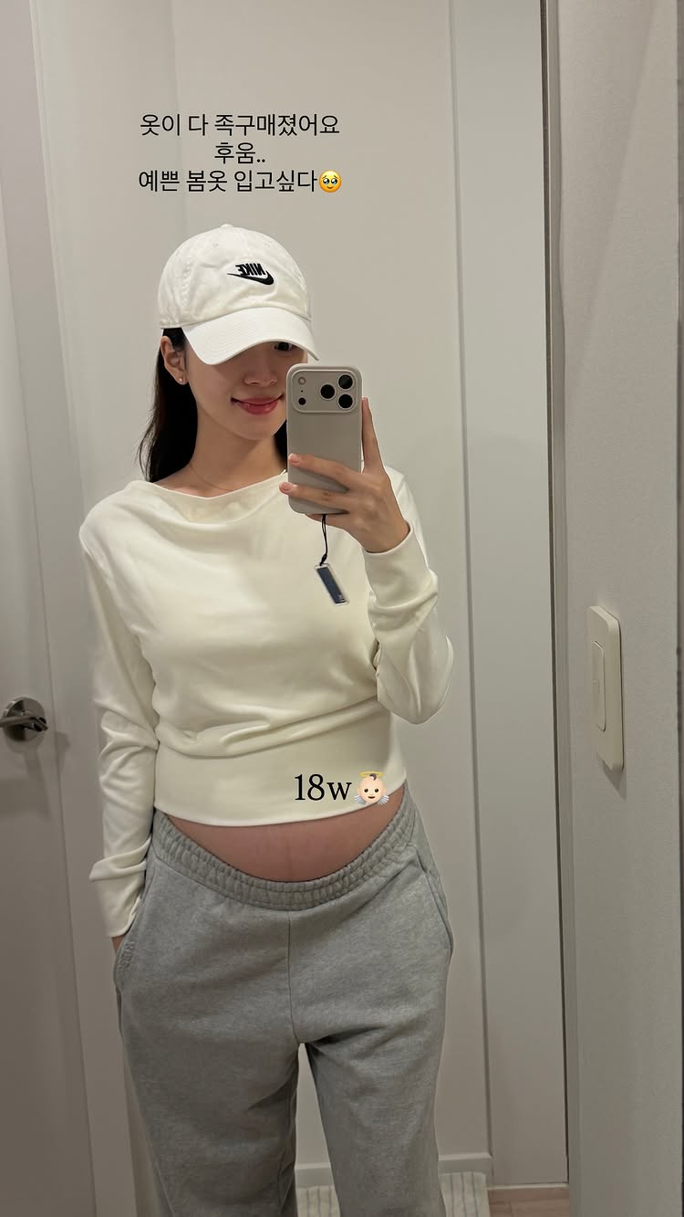 김지영은 임신 18주 근황으로 "옷이 다 작아졌어요. 예쁜 봄옷 입고 싶다"라며 배가 서서히 커진 모습도 전했다.