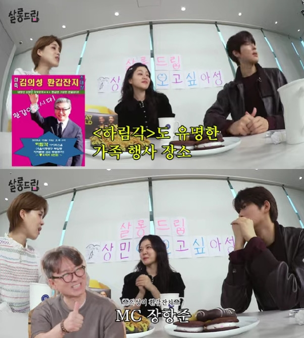 이어 "작년에 환갑이어서 크게 잔치를 열어주고 싶었다. 한복 입히고, 어부바 이벤트도 했다. MC가 장항준 감독님이고, 감독님을 모시고 대학교 발표할 때처럼 PPT 넘기고 그랬다"며 "'오피스'에 나왔던 박정민, 류현경 배우가 나와서 '스승의 은혜'를 합창했고, 인물 퀴즈하고 맞히면 김의성 포토 카드 만들어서 나눠줬다. 다들 받고 서로 가지라고 했던 기억이 있다"고 말해 웃음을 안겼다.