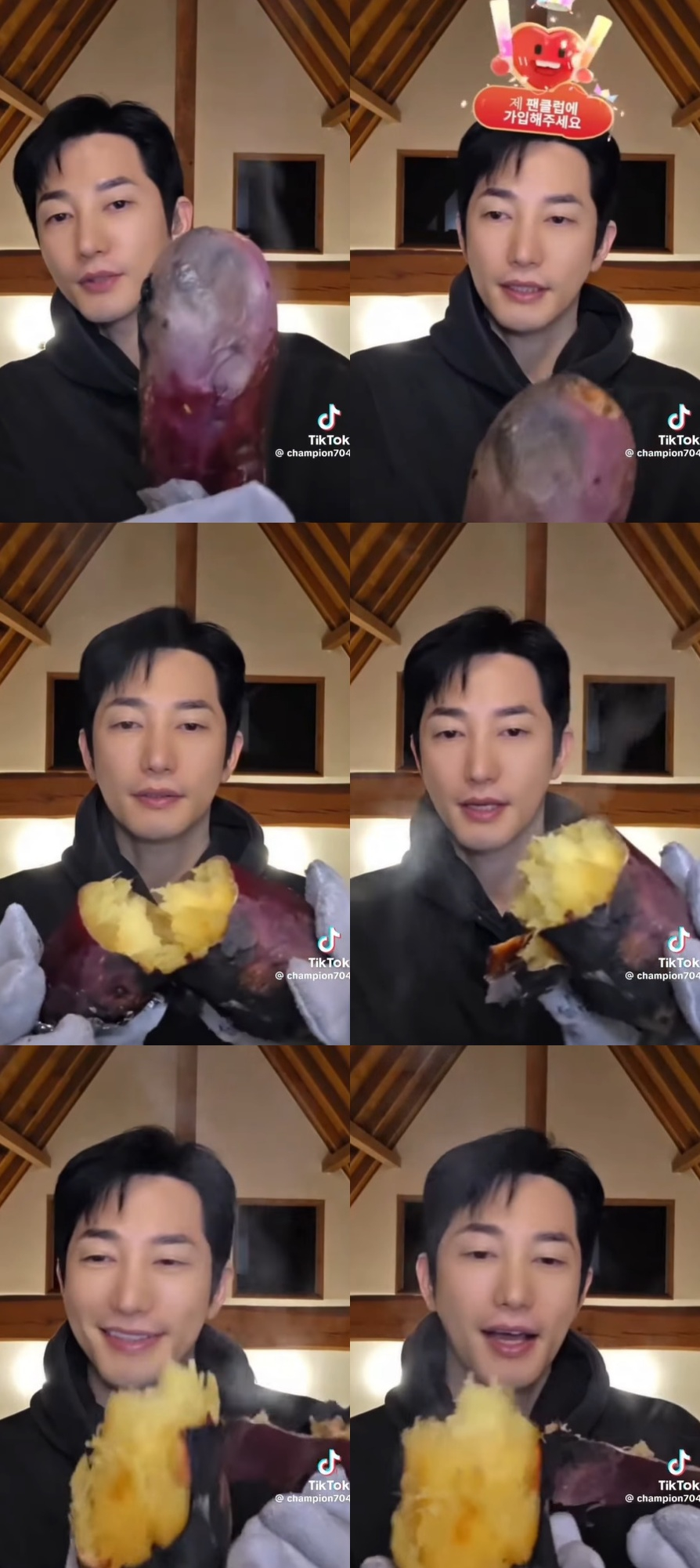 그는 "벽난로에 고구마를 넣었다. 자 고구마가 왔어요"라며 "군밤장수 모자 있는데 가져올 걸"이라며 너스레를 떨었다.