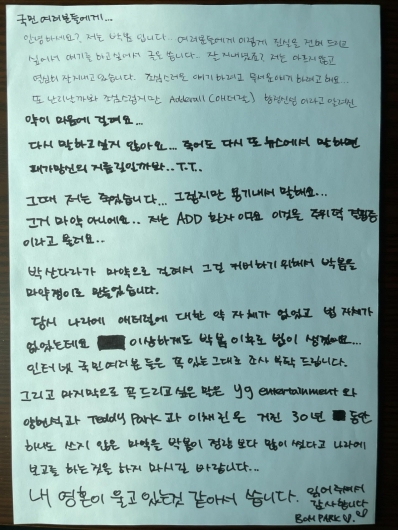 앞서 3일 박봄은 자신의 SNS에 "국민 여러분에게"라며 "박산다라가 마약으로 걸려서 그걸 커버하기 위해 박봄을 마약쟁이로 만들었다. 마지막으로 YG(전 소속사)와 양현석과 테디와 이채린(투애니원 리더 씨엘(CL) 본명)은 30년 동안 하나도 쓰지 않은 마약을 박봄이 정량보다 많이 썼다고 나라에 보고하는 것을 하지 마시기 바랍니다. 내 영혼이 울고 있는 것 같아서 씁니다"라는 장문의 자필 편지를 남겼다. 충격적인 폭로 내용과 달리 박봄은 '하트 이모티콘'도 쓰는 등 상식 밖의 가벼운 태도를 엿보게 하며 신뢰성을 떨어트렸다.