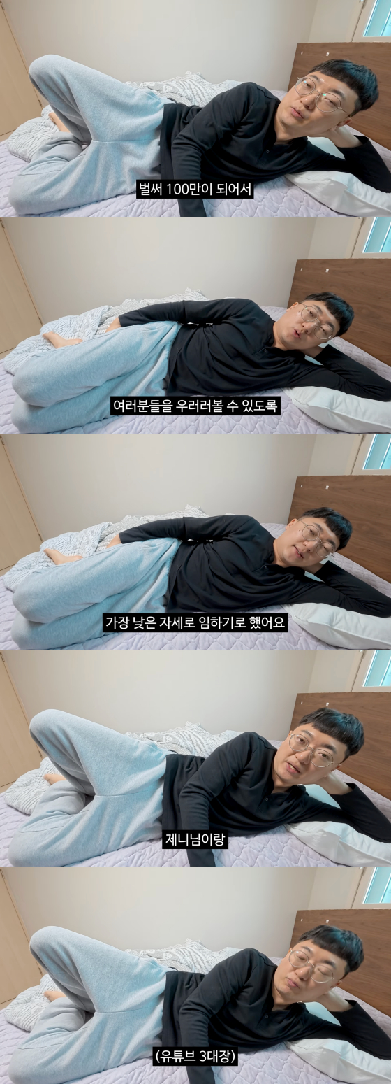 그는 "구독자 100만을 달성했다. 채널을 만든 지 엊그제 같은데 벌써 100만이라 감사한 마음이다. 여러분을 우러러 볼 수 있도록 가장 낮은 자세로 임하려 한다. 항상 구독자를 높이는 마음, 배려하는 마음으로 겸손한, 낮은 자세를 유지하게 됐다"고 눕방의 이유를 설명해 웃음을 자아냈다.