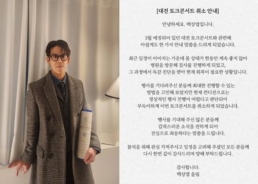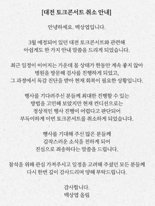 28기 광수는 9일 장문의 글을 통해 "3월 예정되어 있던 대전 토크콘서트와 관련해 최근 일정이 이어지는 가운데 몸 상태가 한동안 계속 좋지 않아 병원을 방문해 검사를 진행하게 됐고, 그 과정에서 독감 진단을 받아 현재 회복이 필요한 상황"이라며 "행사를 기다려주신 분들께 최대한 진행할 수 있는 방법을 고민해 보았지만 현재 컨디션으로는 정상적인 행사 진행이 어렵다고 판단되어 부득이하게 이번 토크콘서트를 취소하게 됐다"라고 전했다.