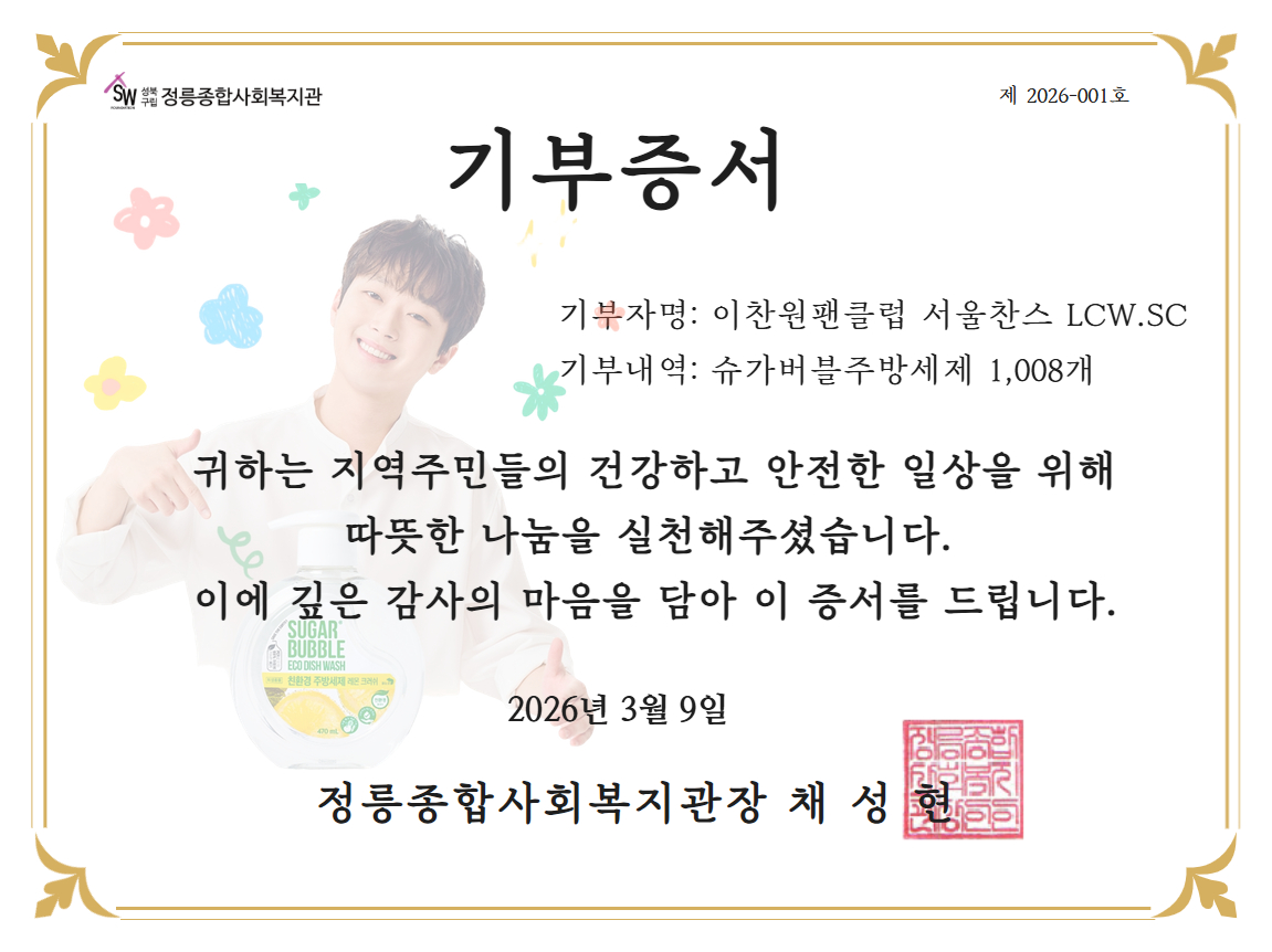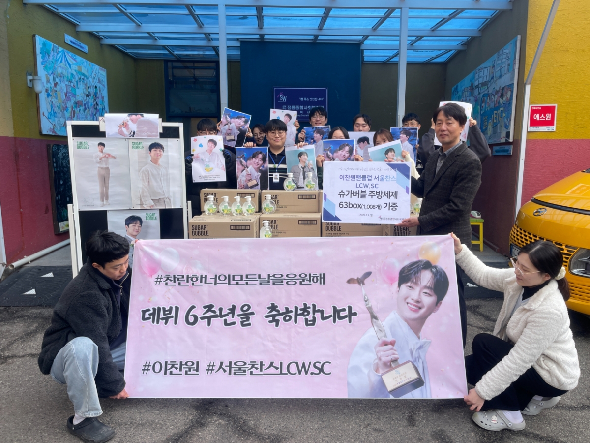 이찬원 팬클럽 '서울찬스LCW.SC'는 3월 9일 서울 정릉종합사회복지관에 이찬원이 모델로 활동 중인 브랜드의 주방세제 1008개를 전달했다. 이번 기부는 이찬원의 데뷔 6주년과 커리어 성취를 함께 기념하기 위한 취지로 진행됐다.