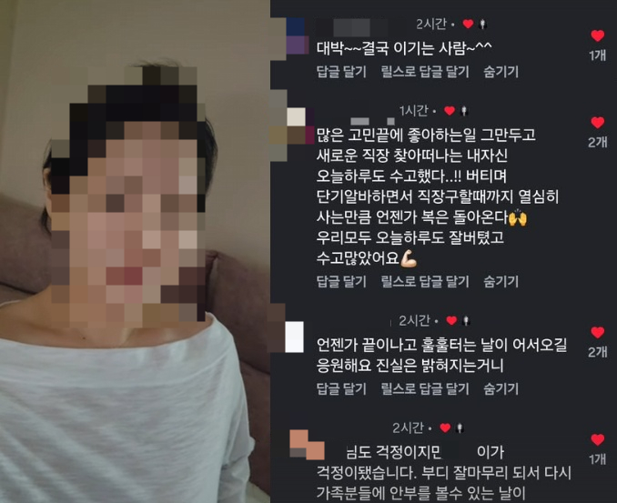 공개된 댓글에는 "대박~ 결국 이기는 사람", "언젠가 끝이 나고 훌훌 터는 날이 어서 오길. 응원해요. 진실은 밝혀지는 거니", "부디 잘 마무리 돼서 다시 가족 분들에 안부를 볼 수 있는 날이" 등의 내용이 담겼다.