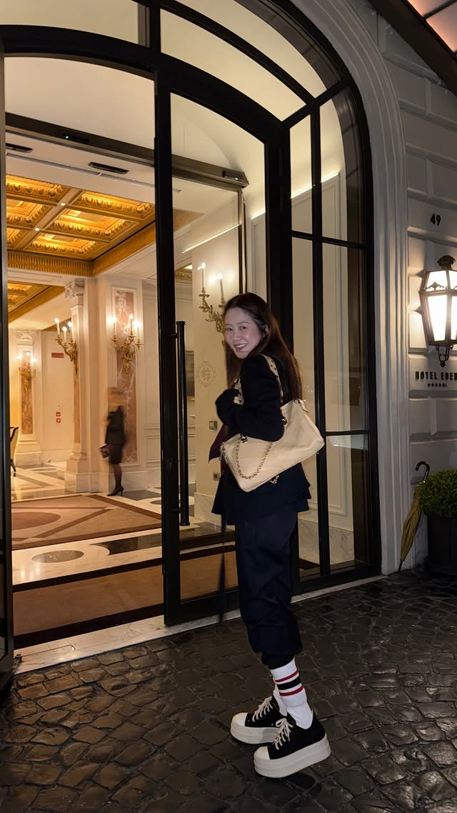 사진 속 고현정은 이탈리아 로마의 최고급 호텔 입구를 나서며 환한 미소를 짓고 있는 모습. 시크한 블랙 셋업에 오버사이즈 베이지 토트백을 매치한 고현정은 굽 높은 스니커즈와 스트라이프 양말을 더하며 힙한 매력을 완성했다.