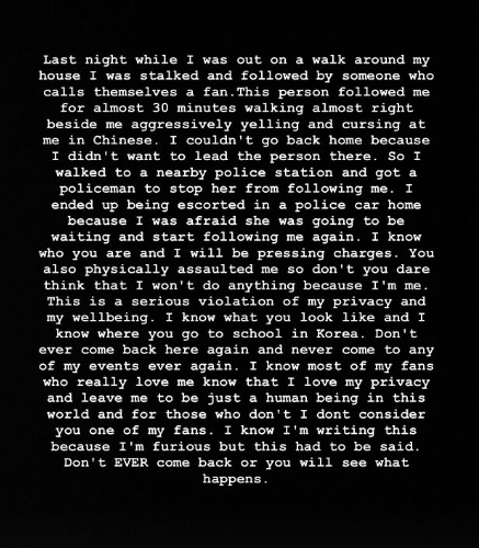 이어 닉쿤은 "나는 당신이 누군지 알고 있고 법적인 조치를 취할 것이다. 당신은 나에게 물리적인 폭행을 해다. 내가 아무것도 못할 것이라고 생각하지 말아라. 나는 당신의 얼굴을 알고, 한국에서 어떤 학교에 다니는지 알고 있다. 다시는 오리 말아라. 대부분 내 팬들은 내가 사생활을 중요하게 생각하는 것을 알고 있다. 나는 당신이 내 팬이라고 생각하지 않는다. 지금 화가 나서 글을 쓰고 있지만, 이 말은 꼭 해야겠다. 다시는 오지 말아라. 다시 온다면 어떤 일이 일어나는지 봐라"라며 경고했다.