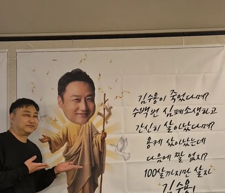 지석진과 김수용의 뒤에는 환갑을 축하하는 현수막이 걸려 있어 눈길을 끌었다. 특히 최근 급성 심근경색으로 의식을 잃고 쓰러졌다가 회복한 김수용을 향해 "김수용이 죽었다며? 수백 번 심폐 소생하고 간신히 살아났다며? 용케 살아났는데 다음에 짤 없지? 100살까지만 살자"라는 유쾌한 문구가 적혀 웃음을 자아냈다. 앞서 김수용은 지난해 11월 경기 가평군의 한 촬영장에서 갑자기 쓰러졌고, 20분가량 응급 처지를 받은 끝에 극적으로 의식을 회복했다.