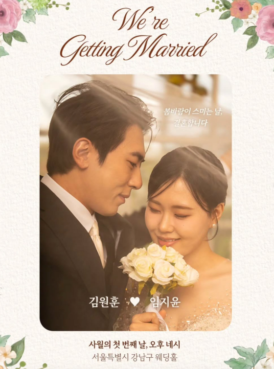 공개된 청첩장에는 '사월의 첫 번째 날, 오후 네 시. 서울특별시 강남구 웨딩홀' '봄바람이 스미는 날 결혼합니다' 등 문구가 적혀 있다.
