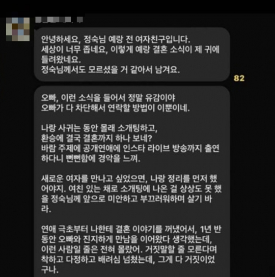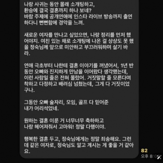 작성자는 "바람 주제에 공개연애에 인스타 라이브 방송까지 출연하다니 뻔뻔하다. 새로운 여자를 만나고 싶었으면 나와의 관계를 먼저 정리했어야지. 여친 있는 채로 소개팅에 나온 걸 상상도 못했을 정숙님께 미안하고 부끄러워하며 살기 바란다"라며 "연애 극초부터 나한테 결혼 이야기를 꺼냈어서 1년 반동안 오빠와 진지하게 만남을 이어왔다 생각했는데 이런 사람일 줄 몰랐어. 거짓말 할줄 모른다며 착하고 다정하고 배려심 넘쳤는데 그게 다 거짓이었구나"라고도 강조했다.