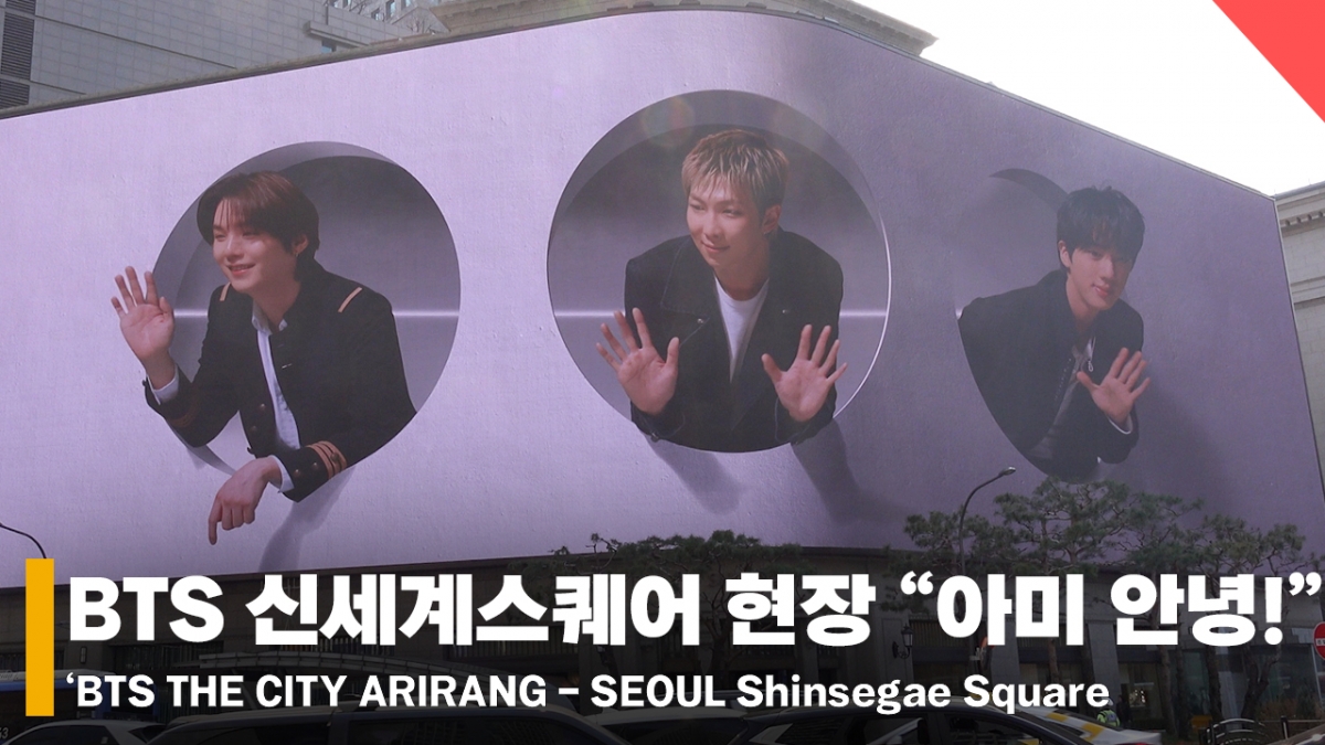 연예방송방탄소년단, 신세계스퀘어 미디어 파사드에 등장 '아미 안녕!' [영상]발행 : 2026.03.20 ・ 16:29전시윤 기자신세계 스퀘어 미디어 파사드에 등장한 방탄소년단 /사진=전시윤 기자20일 오후 서울 중구 소공로 신세계스퀘어에서 'BTS THE CITY ARIRANG - SEOUL' 프로모션의 일환으로 신세계 스퀘어 미디어 파사드가 진행됐다.<저작권자 © 스타뉴스, 무단전재 및 재배포 금지>브리핑20일 오후 서울 중구 소공로 신세계스퀘어에서 'BTS THE CITY ARIRANG - SEOUL' 프로모션이 진행됐다. 이 프로모션의 일환으로 신세계 스퀘어 미디어 파사드가 진행됐다. 방탄소년단이 신세계스퀘어 미디어 파사드에 등장하여 '아미 안녕!'이라고 인사했다.추천 기사전시윤 기자기자홈좋아요연예-방송의 인기 급상승 뉴스연예-방송의 최신 뉴스AD