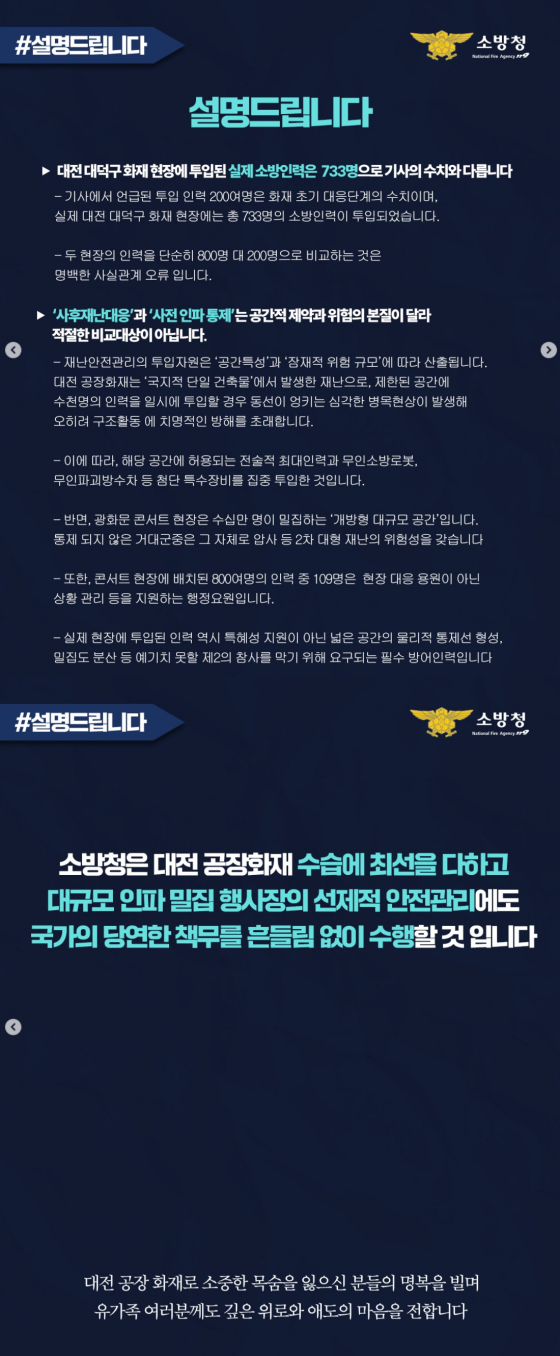 이와 같은 주장에 대해 소방청은 "소방청은 재난의 공간적 특성과 위험규모를 고려해 소방력을 배치하고 있다. 대전 대덕구 공장 화재 현장의 실제 소방인력은 총 733명으로 기사 수치와 다르다. 두 현장의 인력을 단순히 800명 대 200명으로 비교하는 것은 명백한 사실관계 오류"라고 바로잡았다. 보도 내 언급된 200여 명이라는 수치는 화재 초기 대응 단계의 수치라는 것.