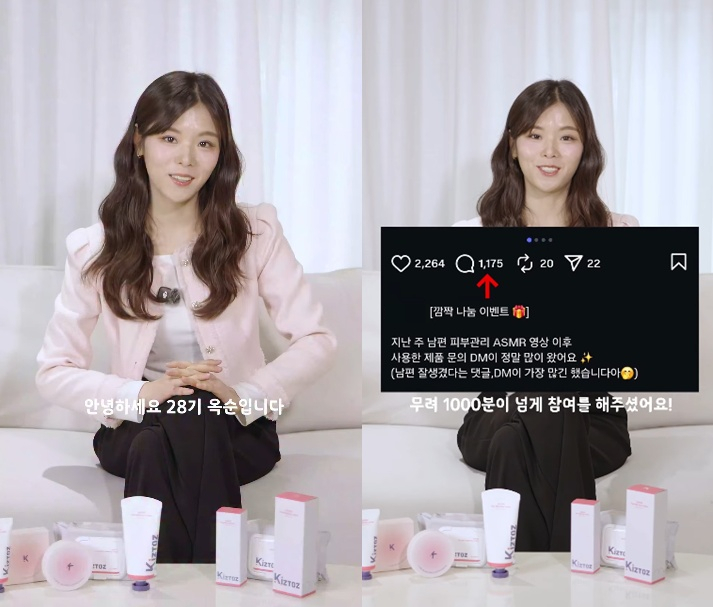 28기 옥순은 23일 공개한 영상을 통해 자신이 홍보하는 제품의 깜짝 나눔 이벤트를 공지했다.