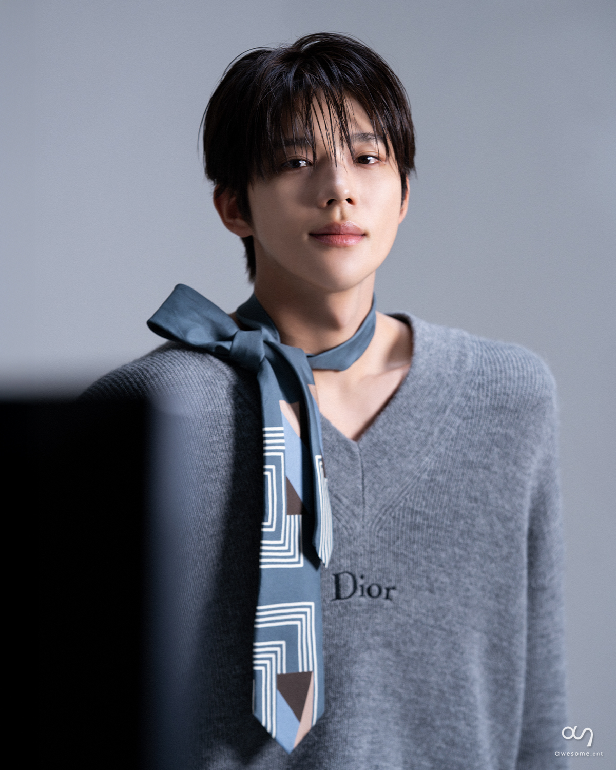 또 다른 비하인드 컷에서는 그레이 톤 니트에 패션 스카프를 매치한 스타일링으로 차분하면서도 세련된 이미지를 그려냈다. 부드럽게 떨어지는 니트의 질감과 목선을 따라 흐르는 스카프 디테일이 어우러지며 미니멀한 스타일에 감각적인 포인트를 더한 것. 과하지 않은 연출 속에서도 자연스럽게 이목을 집중시키는 섬세한 표현력이 돋보였다.