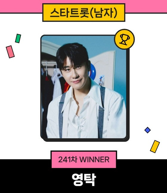 영탁은 지난 19일 오후 3시 1분부터 26일 오후 3시까지 진행된 241차 스타랭킹 스타트롯 남자 랭킹 투표에서 23만 8068표를 획득하며 정상에 올랐다.
