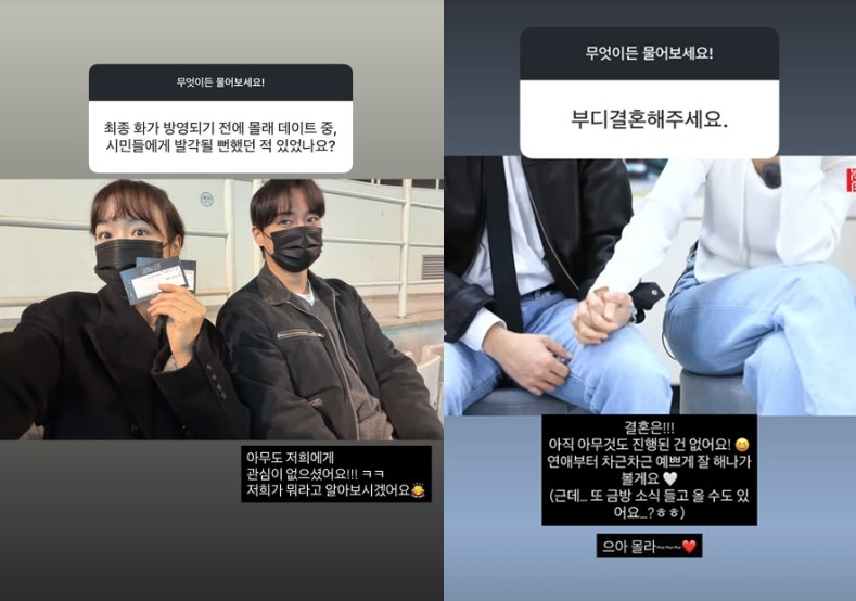 먼저 30기 옥순은 몰래 데이트에 대한 질문에 "아무도 저희에게 관심이 없으셨다. 저희가 뭐라고 알아보시겠어요"라고 답했고 결혼에 대한 질문에는 "아직 아무것도 진행된 건 없다"라며 "연애부터 차근차근 예쁘게 잘 해나가볼게요. 근데 또 금방 소식 들고 올수도 있어요?"라고 답했다.