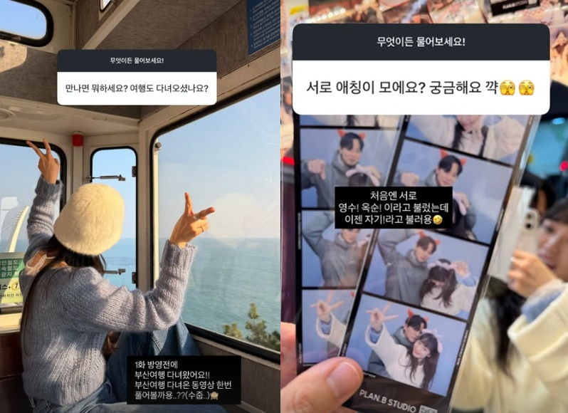 또한 30기 옥순은 애칭에 대해 "처음에는 서로 영수 옥순이라고 불렀는데 이제는 자기라고 부른다"라고 답했고 "영수가 생각보다 질투가 많다"라고 털어놓기도 했다. 이어 첫키스에 대해서는 "이건 비밀"이라며 "부끄러운 질문 금지"라고 답했다.