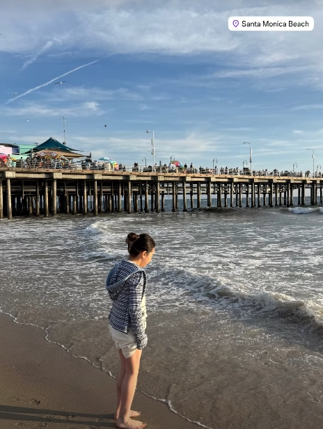 김지우는 산타 모니카 해변에 서 있는 딸의 모습을 공개, "바다를 너무 사랑하는 요 꼬마 녀석"이라고 애정을 드러냈다. 키가 크고 다리가 길쭉한 김지우 레이먼 킴 딸의 모습이 눈길을 끈다.