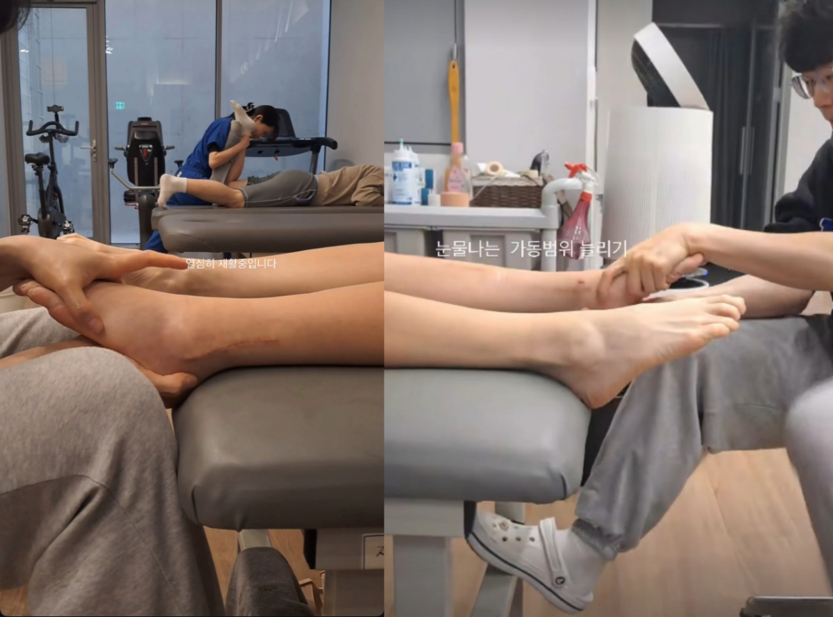 공개된 사진 속에는 발목 수술 이후 재활에 열중하고 있는 엄지원의 모습이 담겼다. 그는 "눈물 나는 가동 범위 늘리기"라고 덧붙였다.