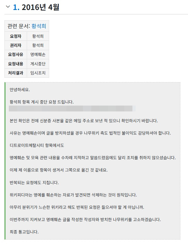 나무위키 측은 해당 요청자를 '황석희'라고 밝히면서 처리결과로 '임시조치'라고 알렸다.