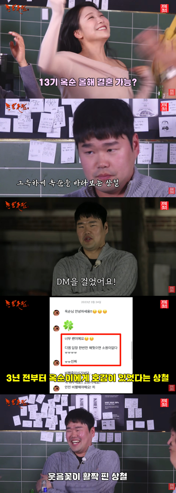 당시 그가 보낸 DM 내용도 공개됐다. 29기 상철은 13기 옥순에게 '너무 팬이다. DM 답장 한 번만 해주면 소원이 없겠다'고 메시지를 전했다.