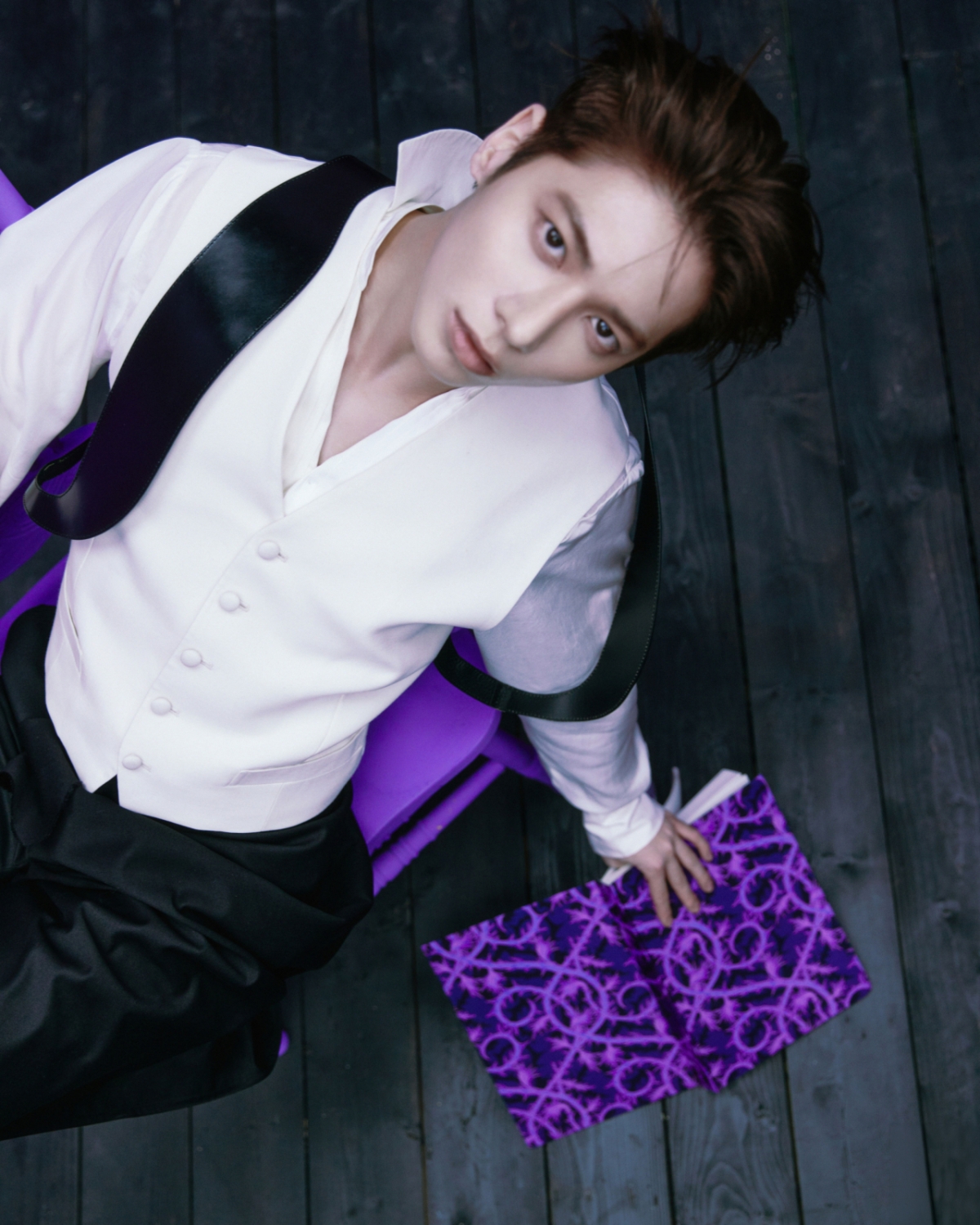 사진 속 투모로우바이투게더는 서로 다른 방향을 응시하며 팽팽한 분위기를 조성한다. 보라색 벽지 위 가시덤불 무늬는 공간 전반에 긴장감을 더한다. 한자리에 있으면서도 어긋나는 시선과 거리감이 관계의 균열을 암시한다.