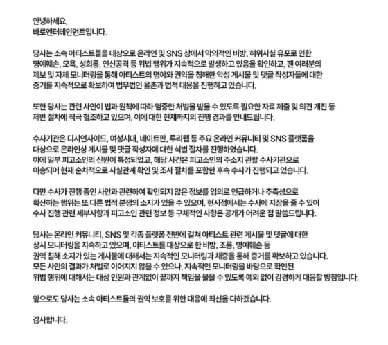 2일 바로엔터테인먼트는 "당사는 소속 아티스트들을 대상으로 온라인 및 SNS 상에서 악의적인 비방, 허위사실 유포로 인한 명예훼손, 모욕, 성희롱, 인신공격 등 위법 행위가 지속적으로 발생하고 있음을 확인했다"며 "일부 피고소인의 신원이 특정되었고, 해당 사건은 피고소인의 주소지 관할 수사기관으로 이송되어 현재 순차적으로 사실관계 확인 및 조사 절차를 포함한 후속 수사가 진행되고 있다"고 밝혔다.