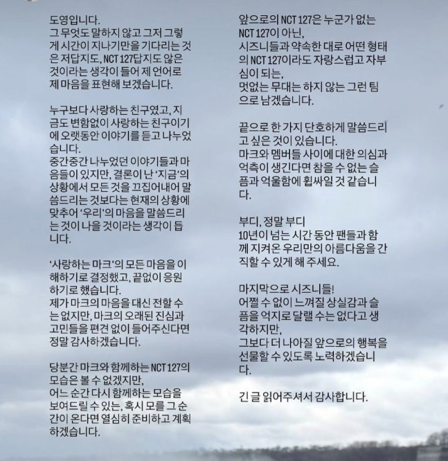 특히 도영은 글을 마무리하며 "마크와 멤버들 사이에 대한 의심과 억측이 생긴다면 참을 수 없는 슬픔과 억울함에 휩싸일 것 같다. 부디 10년이 넘는 시간 동안 팬들과 함께 지켜온 우리만의 아름다움을 간직할 수 있게 해 달라"라고 당부했다.