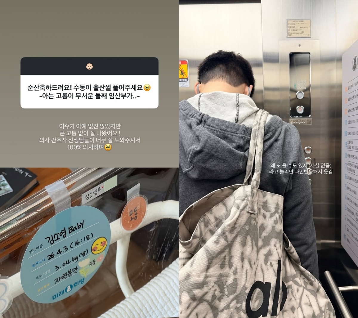 그는 병원 퇴원을 알리며 "둘째 이름은 아직 못 정했다. 이제 같이 지내보면서 이름 영감을 떠올려 보겠다. 병원 퇴원. 이제 병실 층은 마지막이라고 자꾸 주장하는 상진. '왜 또 올 수도 있지'라고 놀리면 과민 반응해서 웃김"이라고 남편의 반응을 이야기했다.
